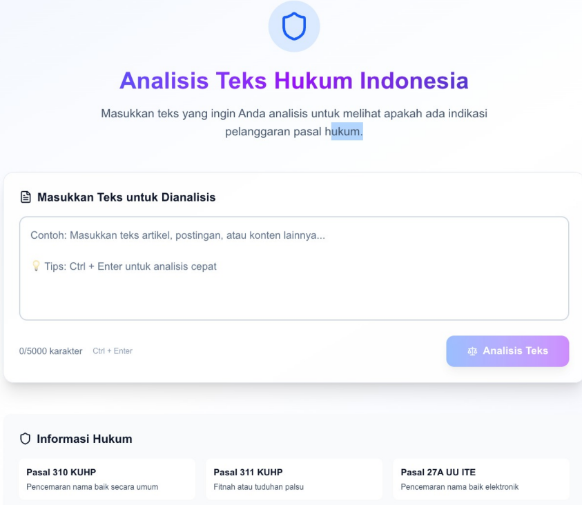 Melalui fitur ini, pengguna dapat memasukkan teks—baik berupa artikel, unggahan media sosial, maupun dokumen tertulis—untuk mengidentifikasi indikasi pelanggaran pasal hukum berdasarkan pendekatan linguistik forensik.